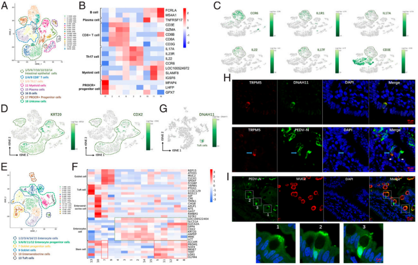 ① 首次繪制感染PEDV(豬流行性腹瀉病毒)的仔豬小腸單細胞圖譜,使用人小腸細胞類型marker鑒定出12種細胞類型,發現豬小腸tuft細胞新特異性標志基因DNAH11,結果表明多數人小腸特異性marker也可以用到豬研究中。此外,豬小腸Th17細胞(3和9簇)特異性高表達IL17A、IL7F和IL22,但不高表達T細胞代表性CD3,這可能與豬T細胞分化有關。