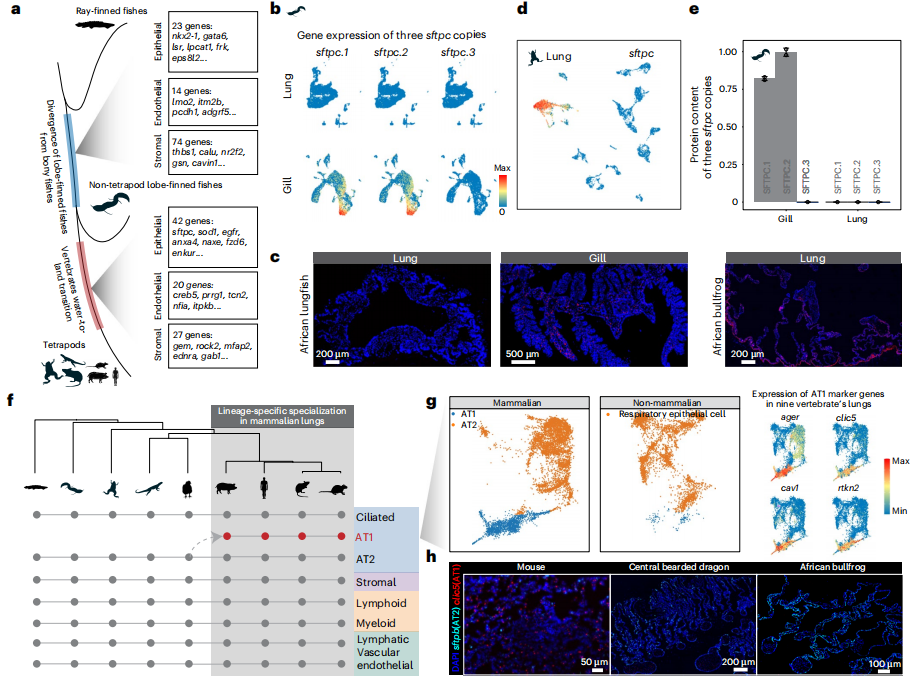 ③ 全基因組復制對肺演化很重要,1866個肺相關直系同源基因中有776個是脊椎動物兩輪全基因組復制(2R-WGD)的產物;哺乳動物譜系特異的基因復制也十分重要,sfta2-/-小鼠表現出明顯的呼吸疾病,包括顯著的炎癥。
