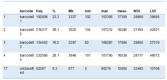 在加入barcode序列混樣測序的情況下,barcode識別區分的結果展示如下,包括barcode識別效率,區分的文庫個數及每個文庫中序列個數占比和長度信息等。