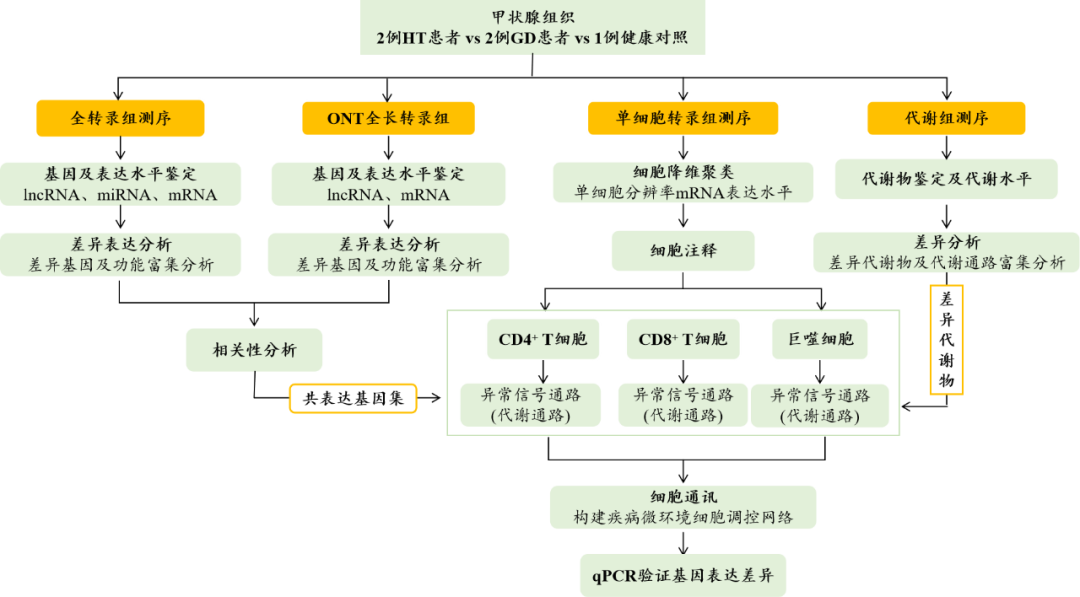 本研究基于HT患者、GD患者和健康對照甲狀腺組織的單細(xì)胞RNA測序、全轉(zhuǎn)錄組測序、ONT全長轉(zhuǎn)錄組測序和代謝組測序數(shù)據(jù),探討了HT和GD疾病微環(huán)境中基因表達(dá)失調(diào)和代謝信號異常的免疫細(xì)胞,構(gòu)建了免疫細(xì)胞的全局調(diào)節(jié)網(wǎng)絡(luò),為進一步了解HT和GD免疫紊亂和代謝異常介導(dǎo)的疾病機制、更好地干預(yù)和治療疾病提供了科學(xué)的理論指導(dǎo)和研究基礎(chǔ)。