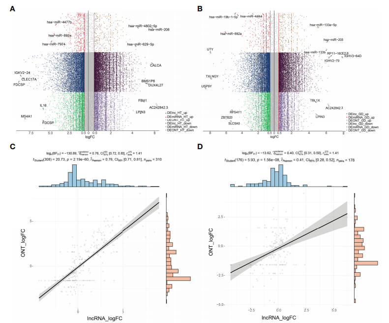 為了鑒定HT組和GD組中異常表達(dá)的lncRNA和miRNA,分別進行了ONT全長轉(zhuǎn)錄組測序和全轉(zhuǎn)錄組測序數(shù)據(jù)。差異表達(dá)分析結(jié)果顯示,共檢測到6,153?個?lncRNA?s和?741?個?miRNAs?在?HT?患者中存在差異表達(dá)(圖?1A);GD患者中檢測到5,492個lncRNAs?和?165?個?miRNAs?存在差異表達(dá)(圖?1B);相關(guān)性分析結(jié)果驗證了本研究中兩種測序方法的檢測穩(wěn)定性(圖?1C,?D)。