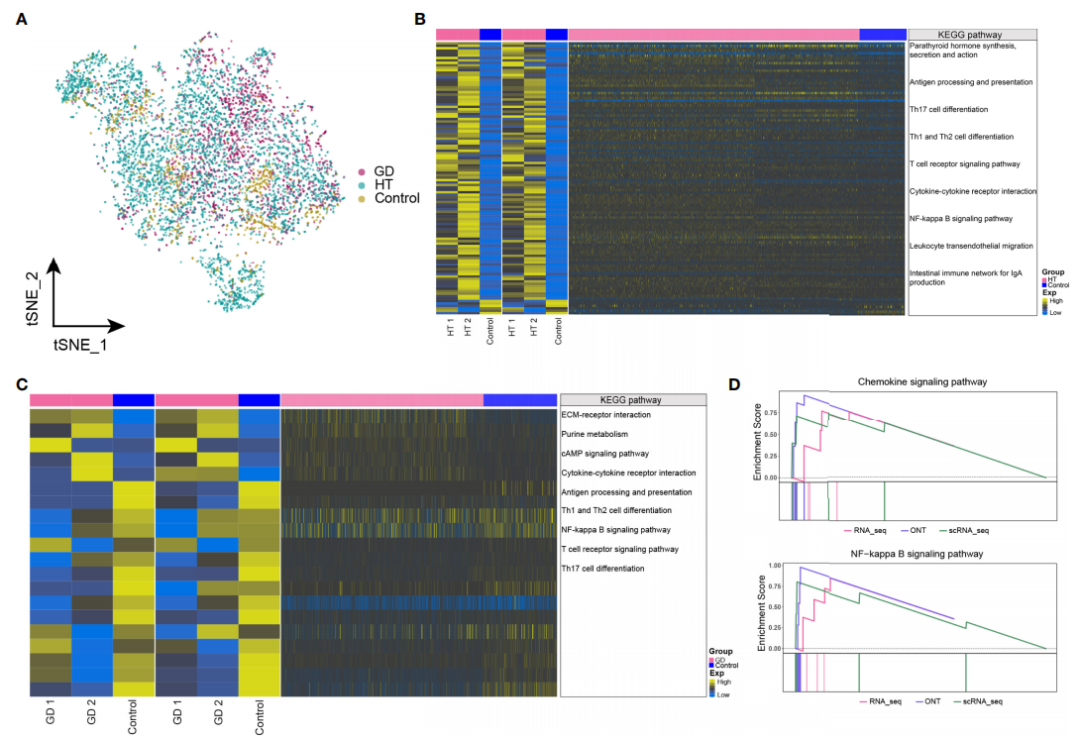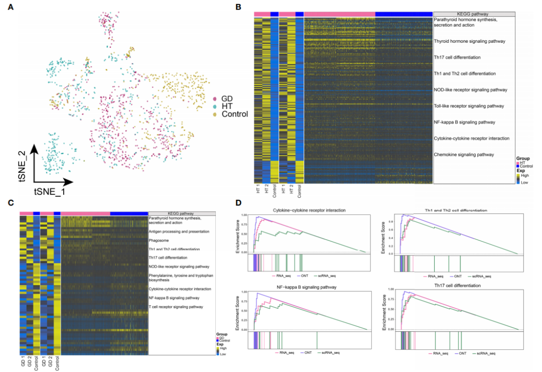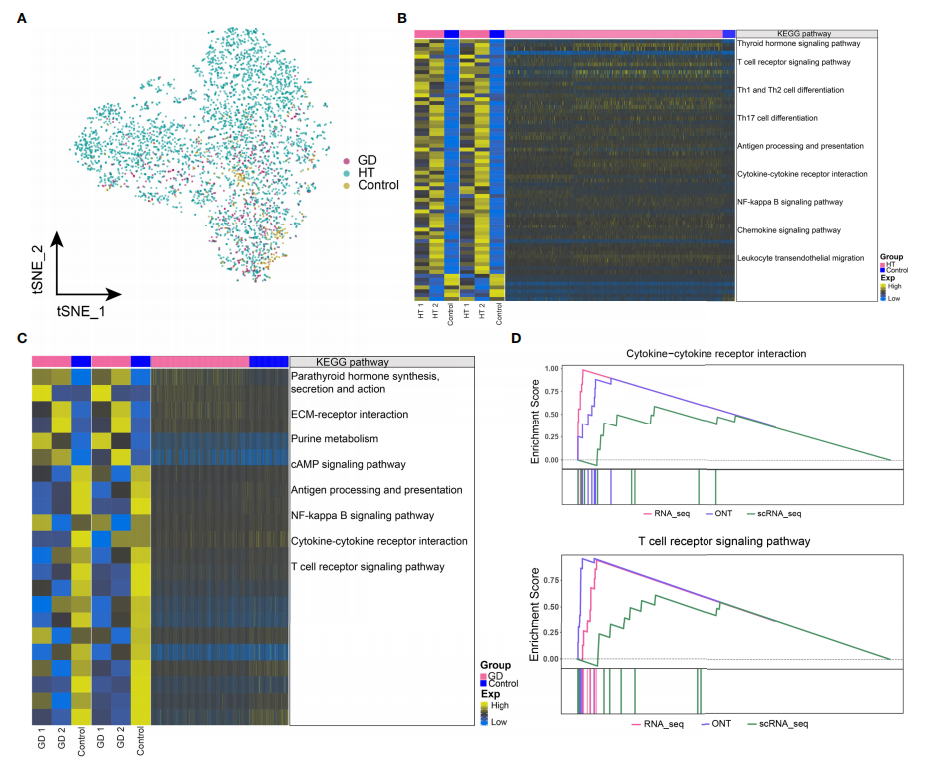 對單細(xì)胞轉(zhuǎn)錄組數(shù)據(jù)中的CD4+?T細(xì)胞亞群進行進一步分析,發(fā)現(xiàn)在HT、GD和對照組中細(xì)胞豐度存在明顯差異(圖?3A)。將bulk?RNA-seq數(shù)據(jù)中顯著差異表達(dá)的基因,與CD4+??T細(xì)胞的單細(xì)胞RNA-seq數(shù)據(jù)中的基因取交集,并對這些共表達(dá)的基因集進行功能富集分析;分析結(jié)果顯示,HT組中顯著差異富集的通路有甲狀腺激素信號通路、T?細(xì)胞受體信號通路、Th1和Th2細(xì)胞分化、Th17細(xì)胞分化、細(xì)胞因子-細(xì)胞因子受體相互作用和NF-kappa?B信號通路(圖?3B);而在GD組中,甲狀旁腺激素合成,分泌和作用、ECM-受體相互作用、嘌呤代謝、cAMP?信號通路、NF-kappa?B?信號通路、細(xì)胞因子-細(xì)胞因子受體相互作用和T細(xì)胞受體信號通路顯著富集(圖?3C?)。GSEA富集分析結(jié)果顯示,HT組中細(xì)胞因子-細(xì)胞因子受體相互作用和T細(xì)胞受體信號通路顯著富集(圖?3D),但GD組中未觀察到顯著富集的通路。此外,氨基酸生物合成和嘌呤代謝相關(guān)的代謝通路在HT和GD組中均顯著富集。
