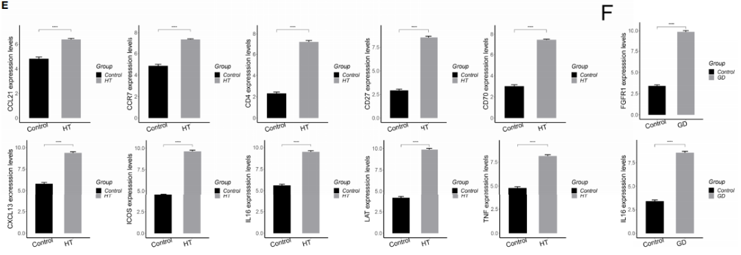 鑒于免疫反應(yīng)在HT和GD中的重要作用,利用GSEA方法進行免疫浸潤分析,進一步評估了樣本中免疫細(xì)胞的豐度,發(fā)現(xiàn)CD4?+T細(xì)胞、CD8?+?T細(xì)胞、巨噬細(xì)胞、Th1和Th2細(xì)胞均有不同程度的浸潤(圖?2H)。