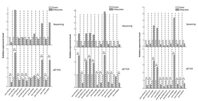 對相應靶基因進行功能注釋來研究差異表達的miRNA可能行使的功能。差異表達的miRNA可以分為四類。第一類包括miRNA家族(miR156、miR164、miR169、miR4412和miR5327),靶基因為轉錄因子SBP、NAC、NFY、GRAS和bHLH,參與調控基因表達和信號傳導。第二類包括miR4411,其對應靶基因涉及抵御疾病。第三類包括miR5761、miR159、miR5667、miR1535、miR511、miR4382和miR4416,其對應靶基因參與植物生長發育中的適應性。為了進一步確認冷脅迫下miRNA和靶基因的關系,選擇了5個miRNAs及其靶基因進行qRT-PCR驗證。結果表明,在冷脅迫下miRNA-164a,miRNA-4411和miRNA-169e上調。相反的,他們的靶基因NAC、DRP和NFY顯著下調。說明miRNA和對應靶基因呈負相關性。