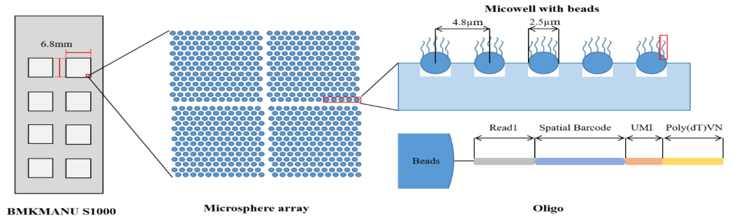 百創(chuàng)S1000(BMKMANU S1000)是由百邁客生物設計并研發(fā)而來的基于微孔微珠上Spatial Barcode實現(xiàn)對組織切片mRNA分子捕獲的亞細胞級空間轉錄組芯片。百創(chuàng)S1000可以廣泛應用于生物器官發(fā)育、神經(jīng)科學、免疫感染、脅迫應激、生物遺傳進化等生命科學領域的研究。