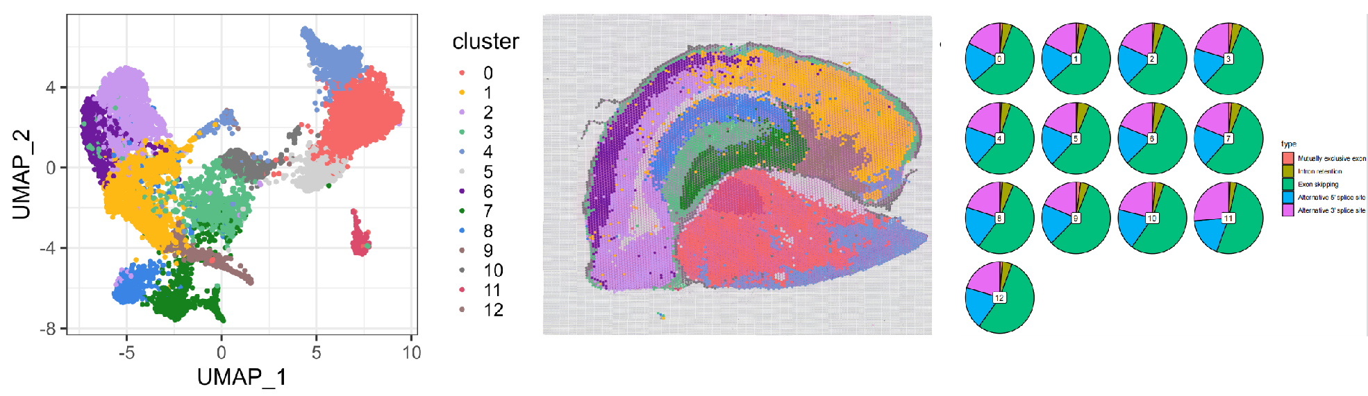二代與三代數(shù)據(jù)的UMI/Gene counts per spot的相關性還是tSEN/UMAP的降維聚類,都顯示具有非常高的一致性。這充分說明百創(chuàng)S1000-Nanopore全長轉錄組產(chǎn)品完全可以獨立進行數(shù)據(jù)的拆分與挖掘分析,無需依賴NGS數(shù)據(jù)的校正。