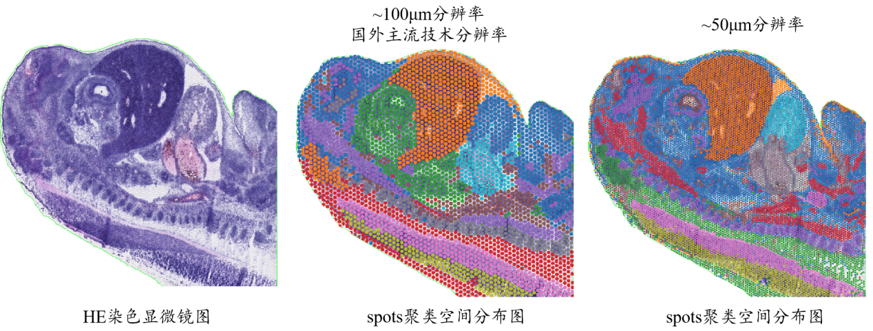 百創(chuàng)S1000分辨率最高可達到4.8μm,相比目前主流空間轉錄組測序芯片精度提高了近400倍,高分辨率下HE染色組織形態(tài)學與spots聚類空間分布圖重合度更高,可以更加精準識別空間基因表達的異質性和組織區(qū)域的特異性。